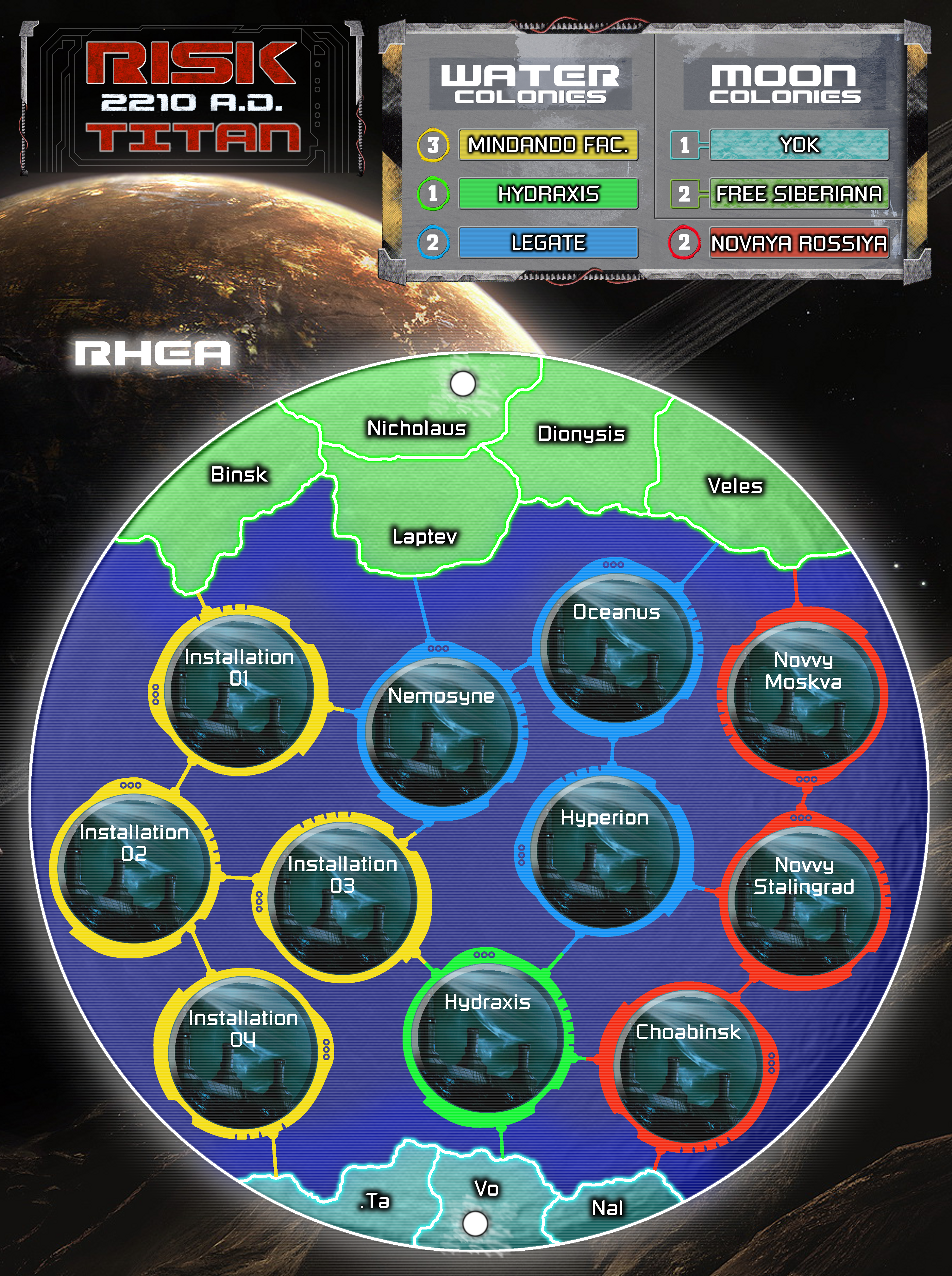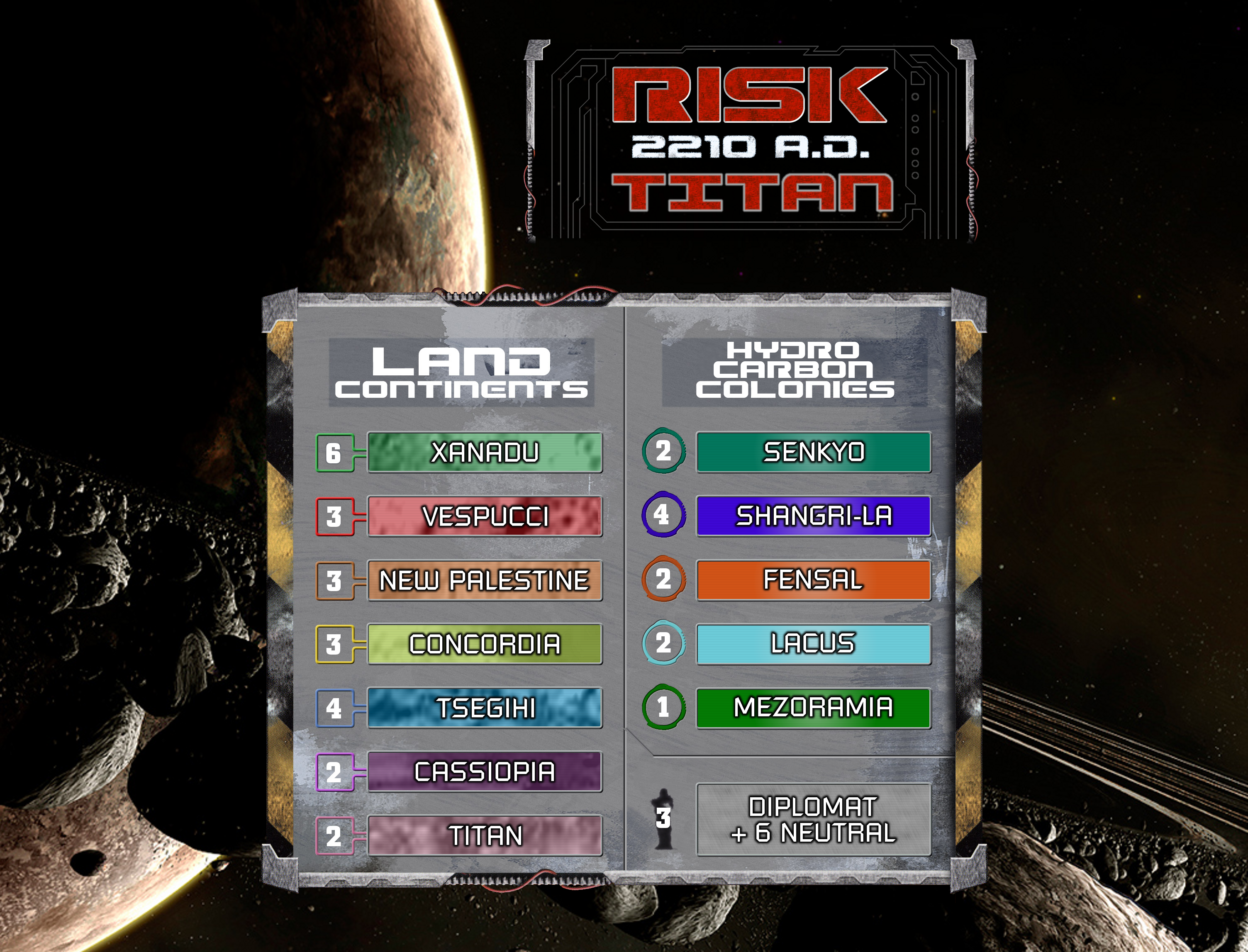 The bundled expansion pack contains high-resolution versions of the Titan map, Rhea map, Continent bonus reference card, and each territory card.